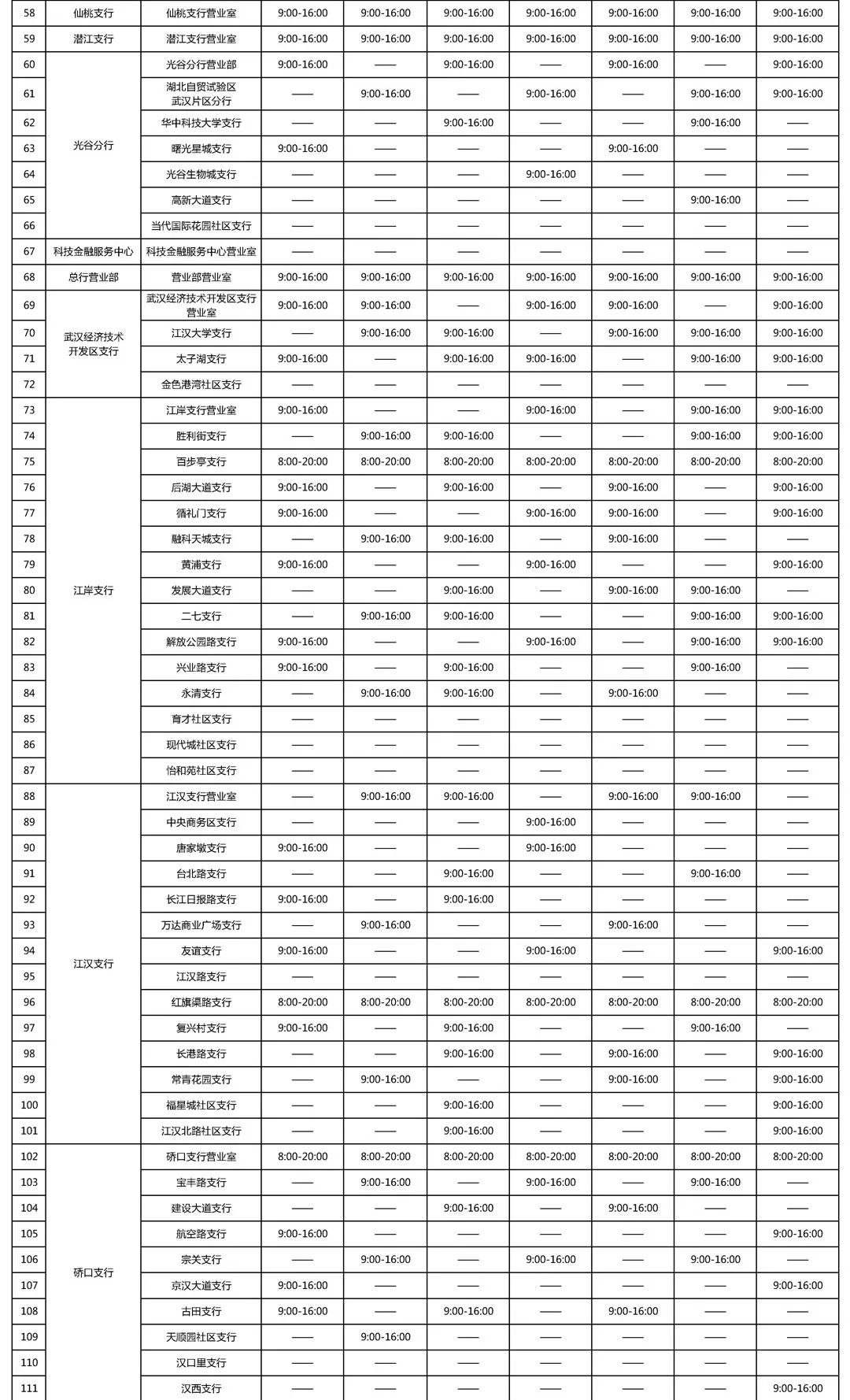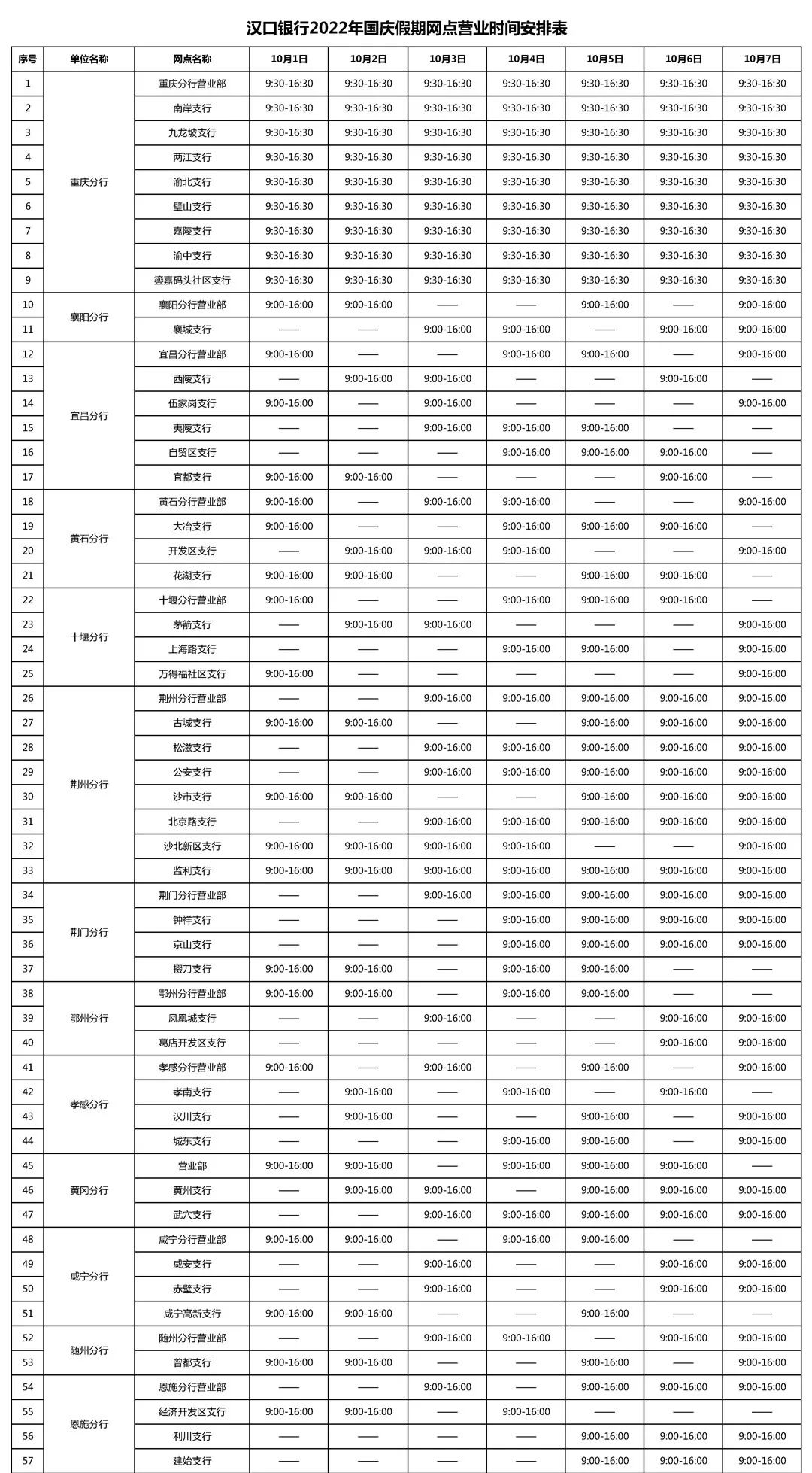 汉口银行2022年国庆节营业网点时间安排公告 KUH育儿早教网