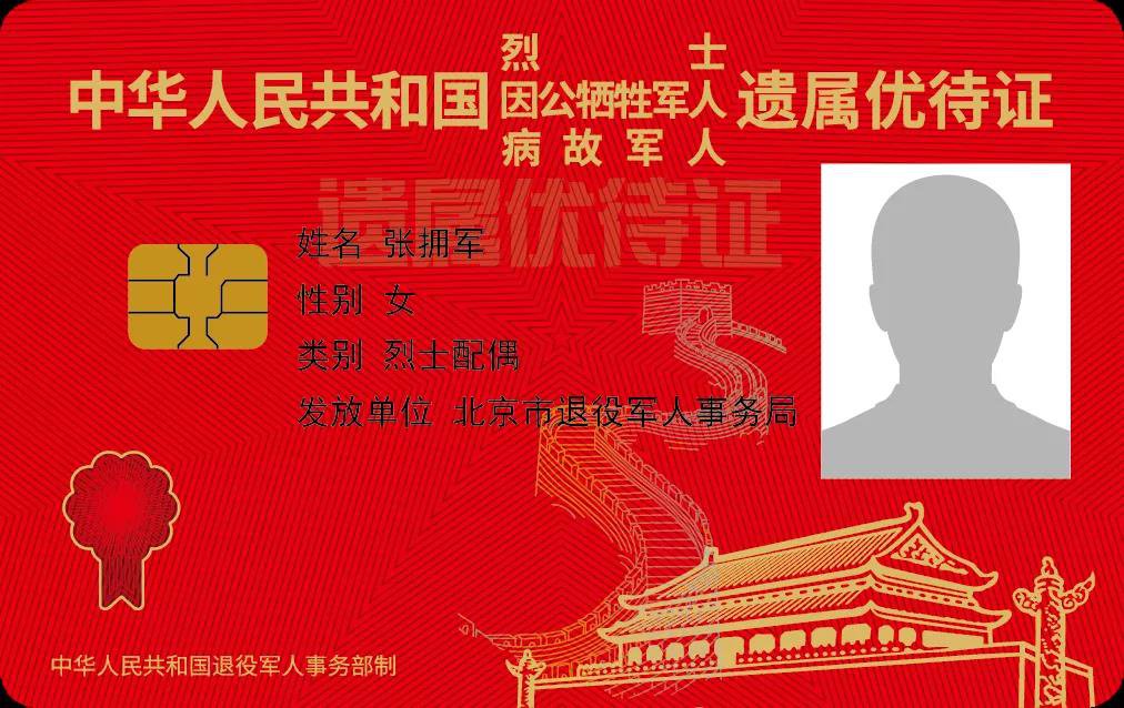 “中华人民共和国烈士、因公牺牲军人、病故军人遗属优待证”式样: