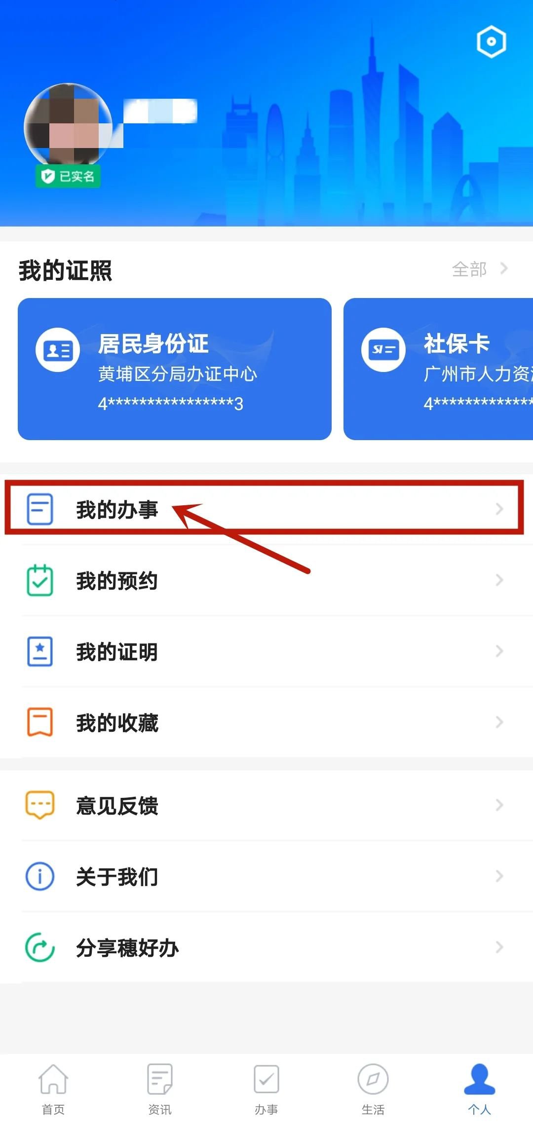 5、“穗好办”APP“个人”页面,点击进入“我的办事”。