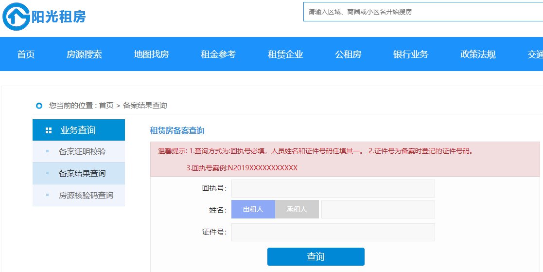租赁备案结果的查询方式租赁当事人可用回执号或备案号登录阳光租房(http://zfcj.gz.gov.cn/ygzf/),查询租赁备案结果。