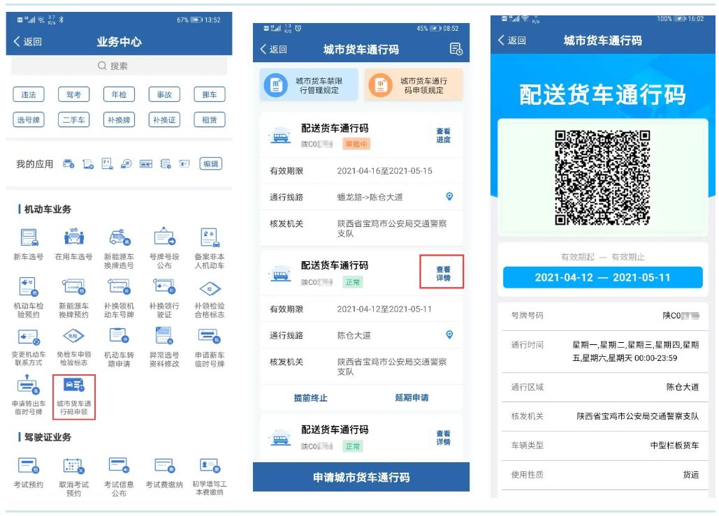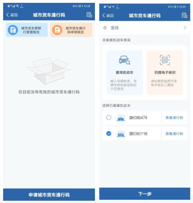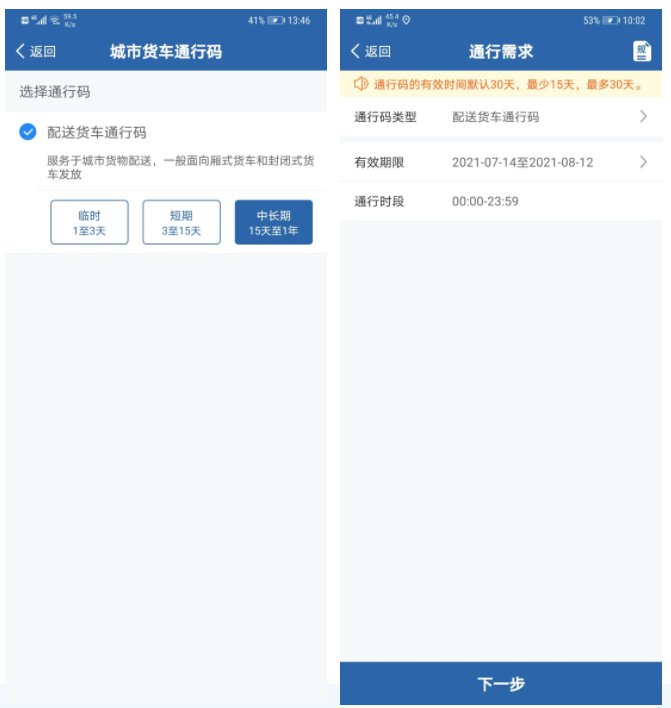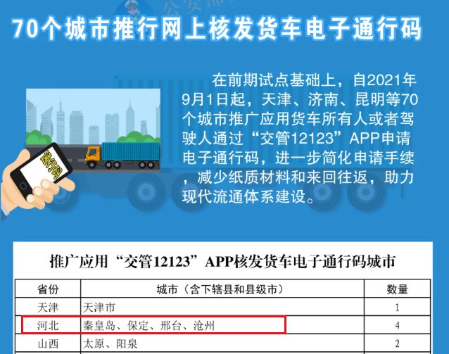为落实便利货车在城市道路通行的改革举措,方便货运企业、车辆申领城市货车通行码,公安部交通管理局依托“交管12123”APP,增加“城市货车通行码申领”模块,推行网上核发货车电子通行码,让数据多跑路群众少跑腿。自2021年6月1日起,公安部组织南京、南昌、海口、乌鲁木齐4个城市,试点利用“交管12123”APP核发货车电子通行码。在试点的基础上,公安部决定扩大应用范围,组织全国70个城市自今年9月1日起,推广利用“交管12123”APP网上核发货车电子通行码。其中包括河北省秦皇岛、保定、邢台、沧州4地。