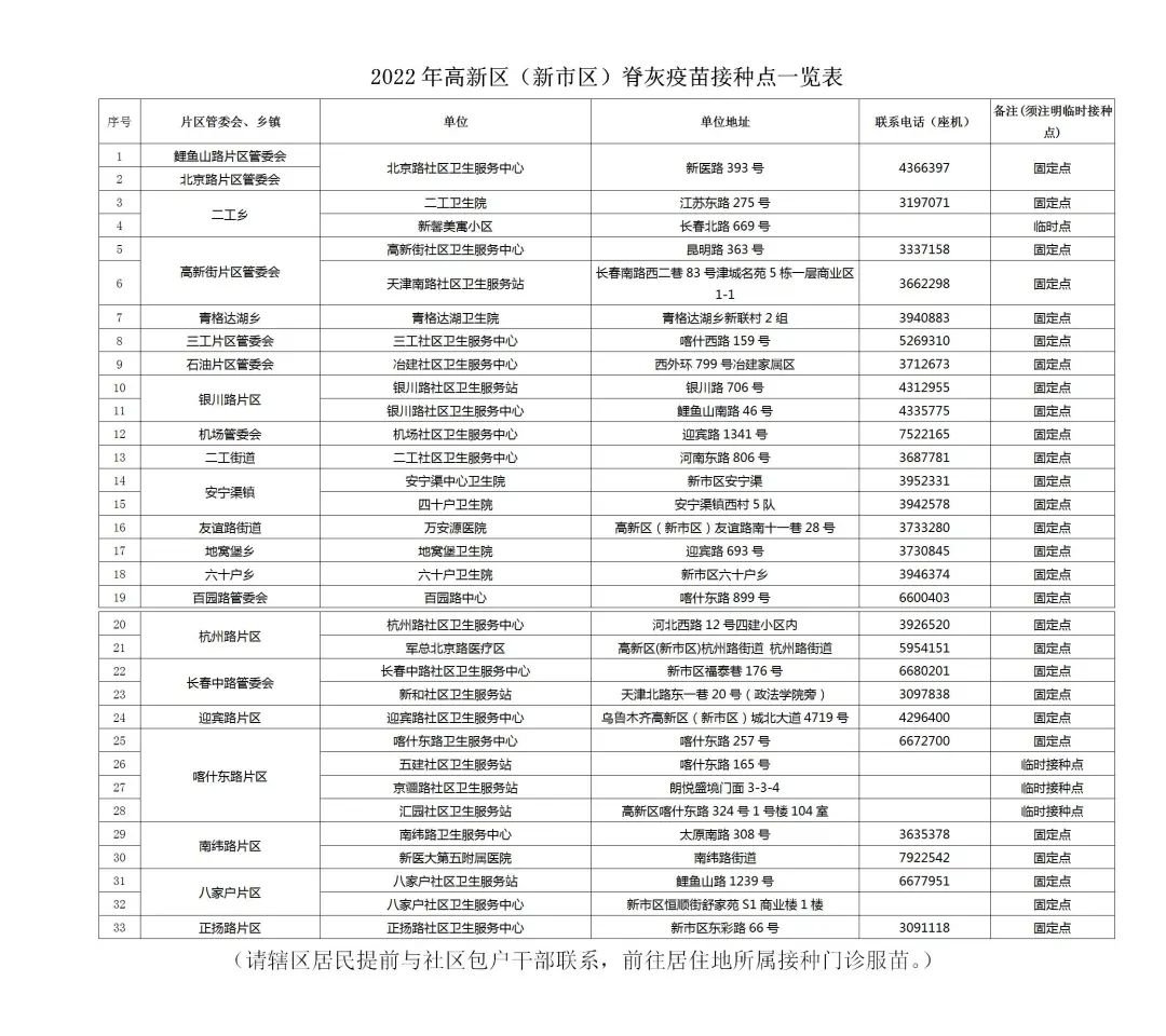 2022年高新区(新市区)脊灰疫苗接种点一览表
