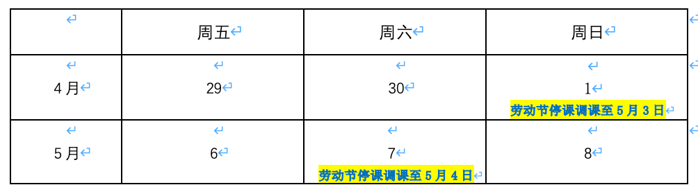 2022年5月1日(周日)全天的培训课程调课至5月3日(周二)相同时间段进行;5月7日(周六)全天的培训课程调课至5月4日(周三)相同时间段进行,其余课程安排不变。