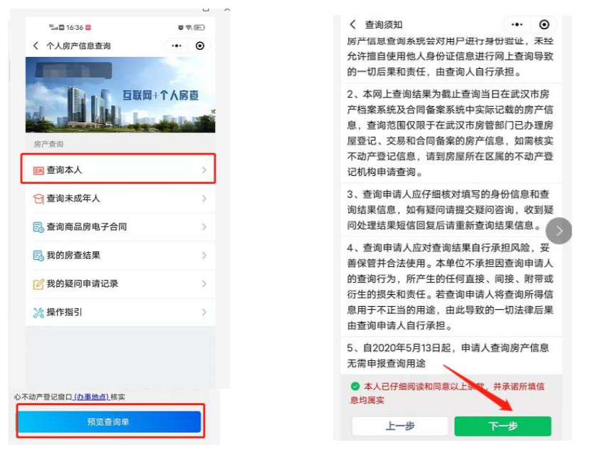 Step3: 选择“查询本人”,点击预览查询单。勾选“查询须知”,点击下一步uWN育儿早教网