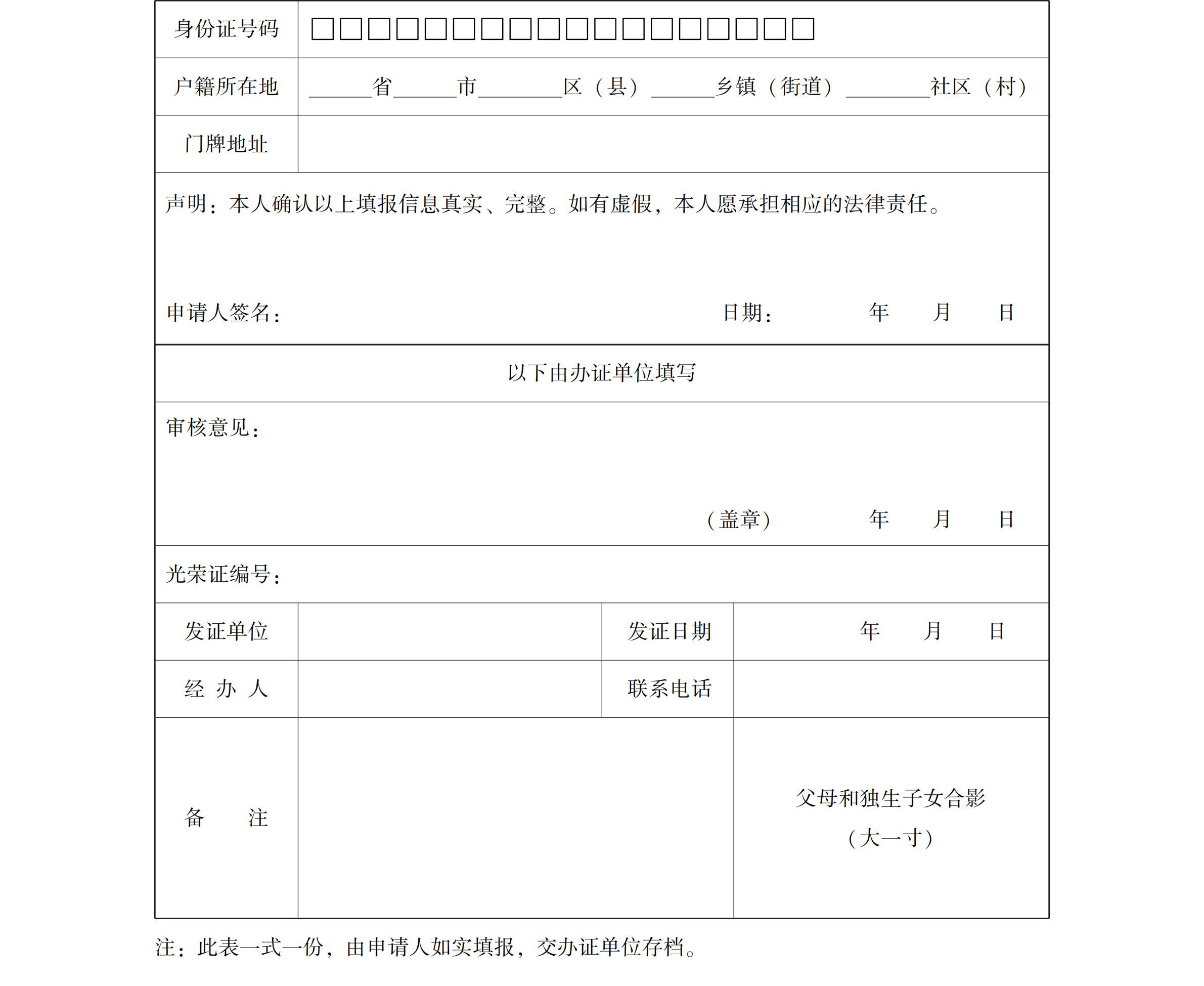 《光荣证》由夫妻共同提出(离异/丧偶的申请人由本人提出),办证单位依申请按以下规定办理: