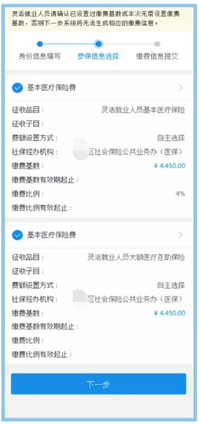 第三步:勾选“灵活就业人员基本医疗保险”、“灵活就业人员大额医疗互助保险”,点击“下一步”。