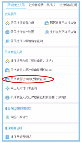 第五步:缴费成功后通过“灵活就业社保费已缴费查询”可查询为本人或他人缴费的所以记录;通过“第三方支付订单查询”可查询通过微信或支付宝缴费的订单。