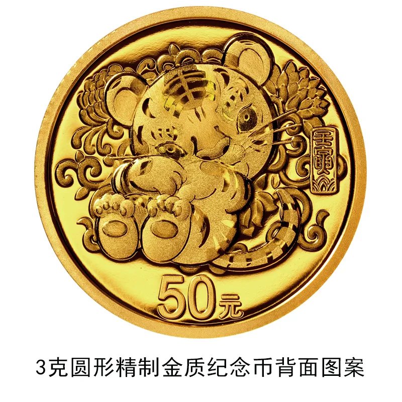 3克圆形金质纪念币和15克圆形银质纪念币(彩色)背面图案均为卡通风格小虎造型,衬以吉祥花卉等装饰: