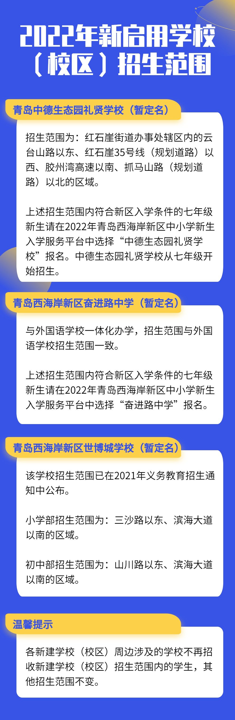 2022年秋季有三所学校(校区)投入使用,包括青岛中德生态园礼贤学校(暂定名)、青岛西海岸新区奋进路中学(暂定名)、青岛西海岸新区世博城学校(暂定名),启用时间将根据各学校启用条件确定,具体招生范围见图片。