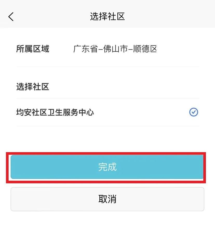 第六步:完善个人信息后,选择社区,选择“广东省-佛山市-顺德区-均安社区卫生服务中心”并点击完成。