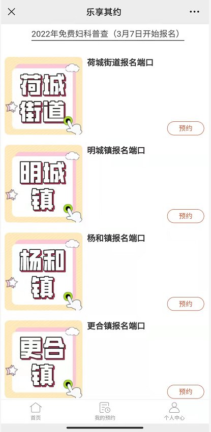 名额分配:免费妇检名额共2480个,其中荷城街道1370个、杨和镇200个、明城镇220个、更合镇310个,定点厂企380个,以居住地或工作地为准。