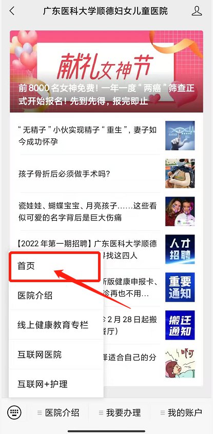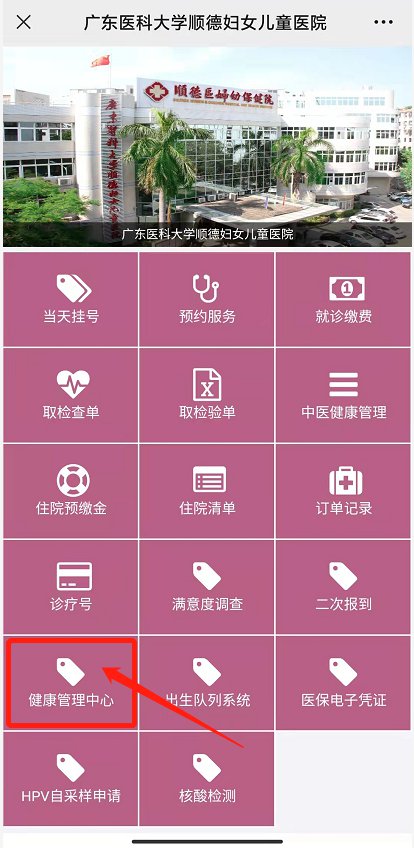 预约入口:个人可以通过关注“广东医科大学顺德妇女儿童医院”微信公众号预约方式到我院第二门诊部(顺德电视台旁)进行免费检查。