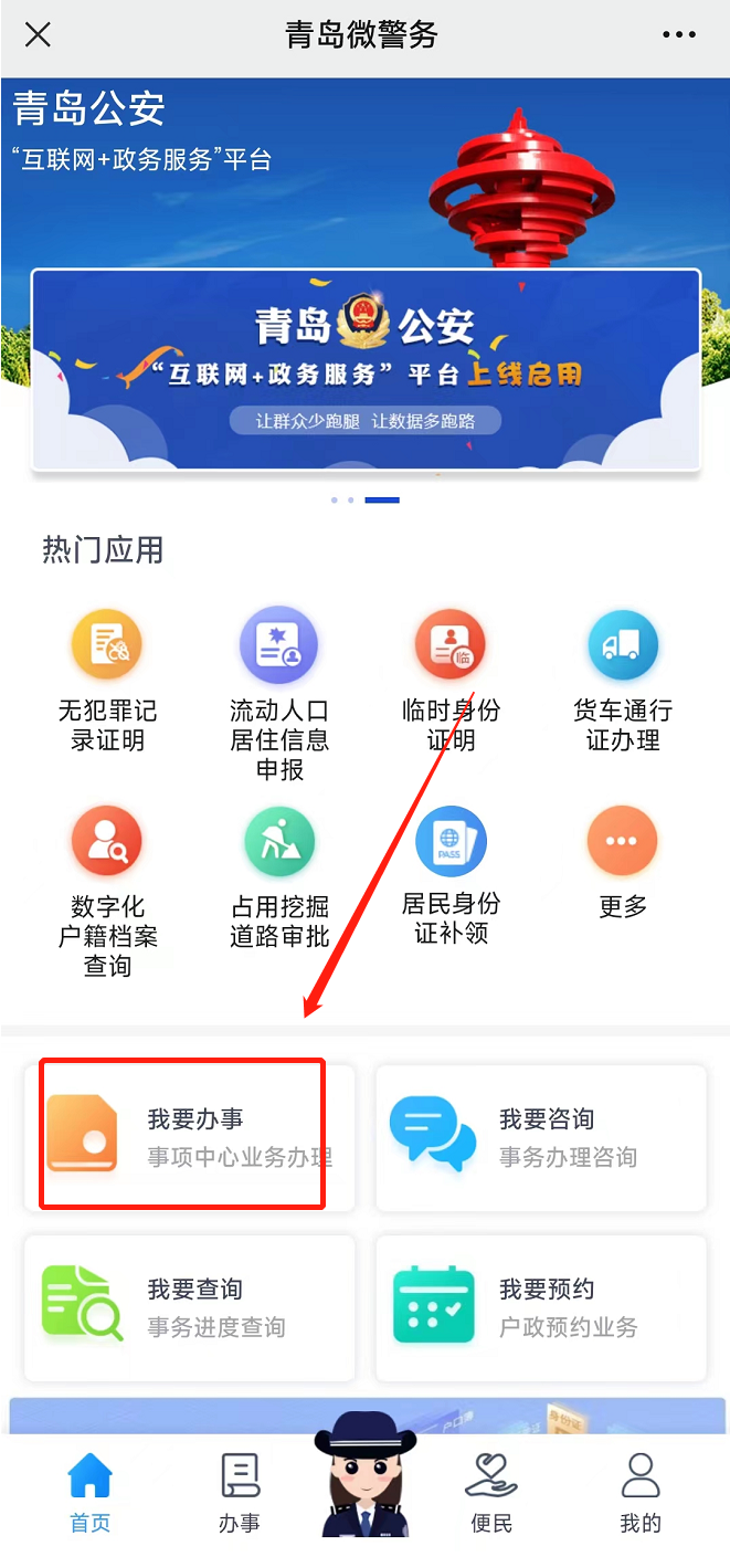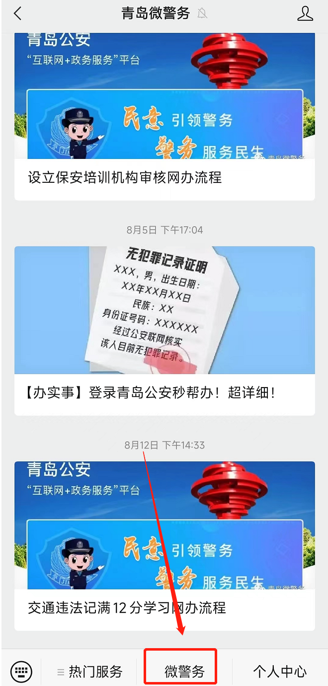 1、进入“青岛微警务”,点击菜单栏“微警务”