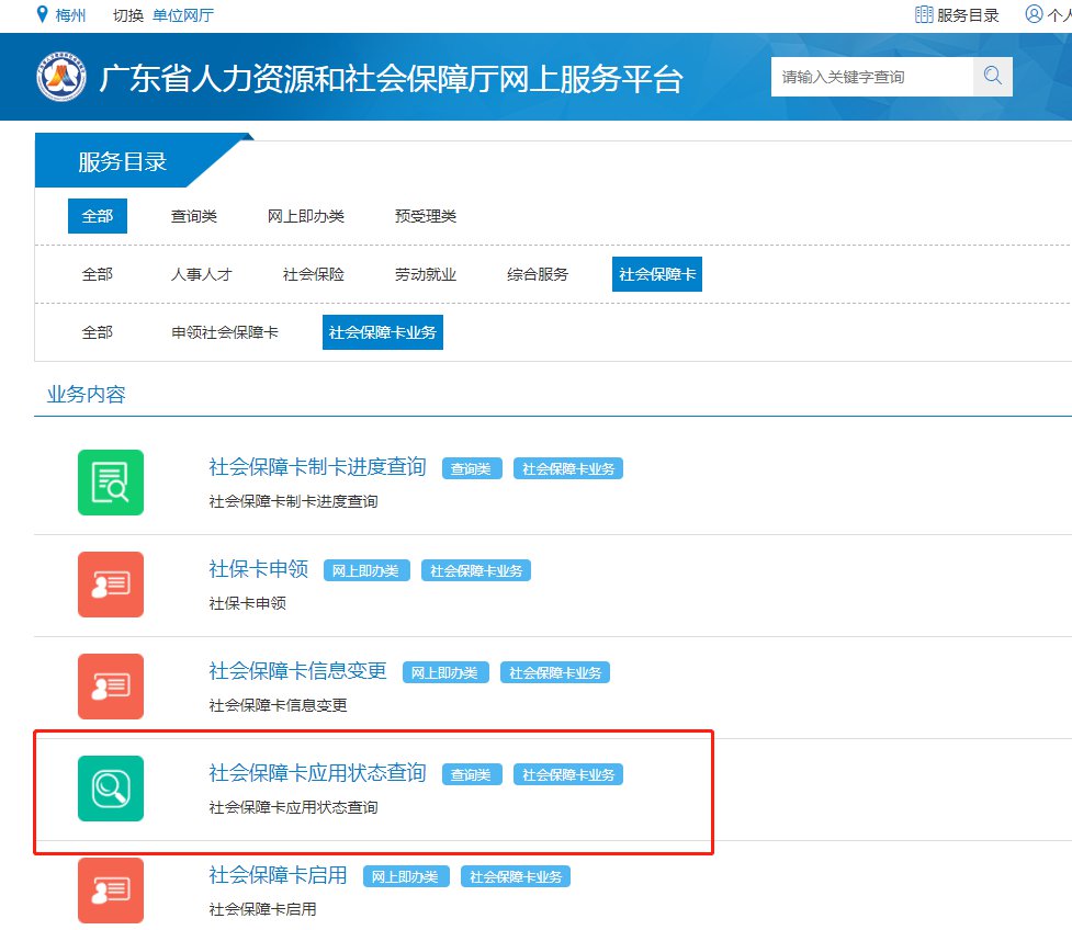 点击登录“广东省人力资源和社会保障厅网上服务平台”,选择首页“社会保障卡”服务,跳转页面后即可看到“社会保障卡应用状态查询”服务。除此之外,还可以登录微信小程序“电子社保卡”进行查询。