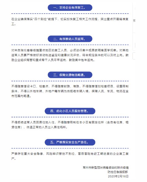 常州市新型冠状病毒感染的肺炎疫情防控应急指挥部发布支持企业复工复产的通告