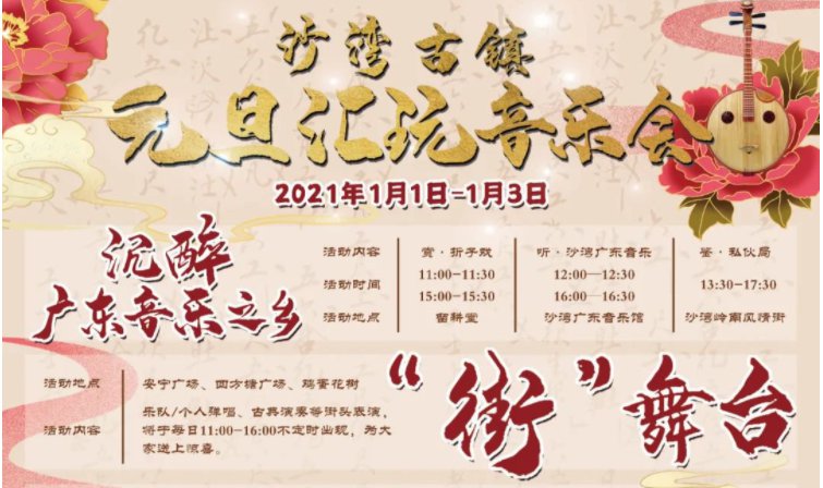 沙湾古镇作为广东音乐发源地之一,沉淀百年音乐氛围,在2017年获评国家AAAA级旅游景区,景区内著名岭南建筑“留耕堂”在2019年被评为“国家重点文物保护单位”。沙湾古镇多年来专注打造文化及独有品牌活动,成为众多文化企业、团队的孵化地。在即将到来的2021年元旦假期,结合汉服游古镇、音乐游古镇主题,举行“2021沙湾古镇元旦汇玩音乐会”活动。汇集传统的广东音乐、古琴演奏、折子戏、现代流行乐队演奏等,展示一个有文化而又年轻活力的沙湾古镇。