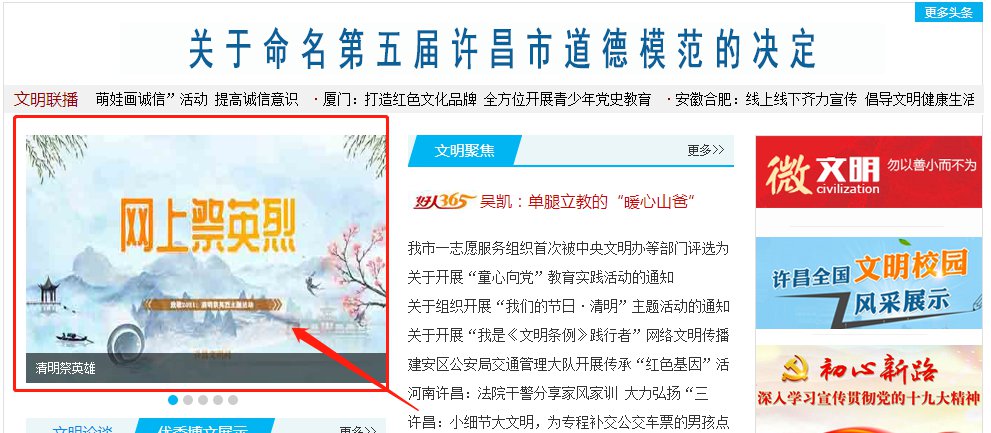 第二步:进入到许昌文明网,查看首页幻灯切换栏目,找到“网上祭英烈”栏目;