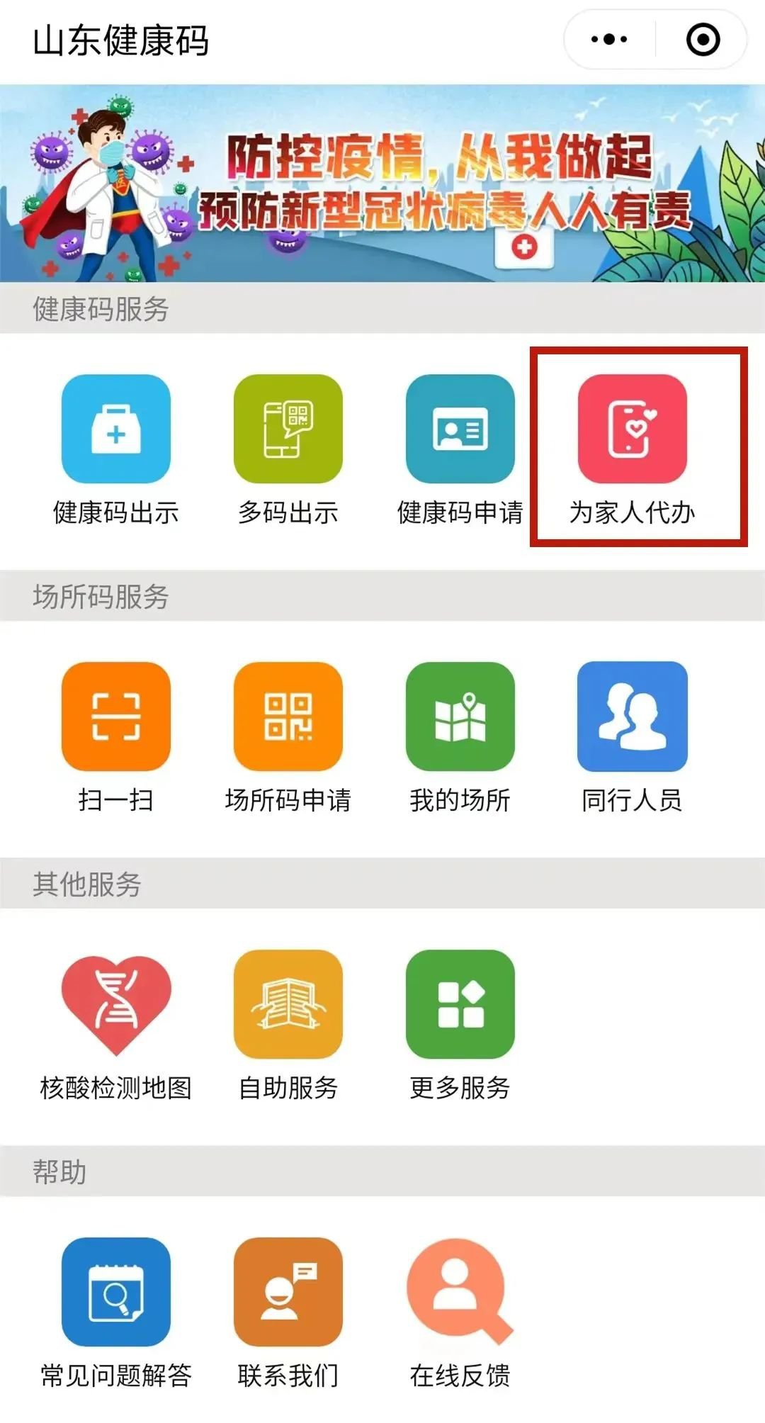 当前,进入公共场所、乘坐公共交通时,需扫场所码查验个人健康状态。针对老年人、婴幼儿、青少年等各类不方便持有或使用智能手机的特殊群体,“山东健康码”特别增加了“代扫登记”功能,家人或陪同人员可帮助完成扫场所码。