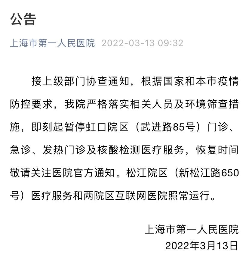 上海市第一人民医院2022年3月13日发布公告:接上级部门协查通知,根据国家和本市疫情防控要求,我院严格落实相关人员及环境筛查措施,即刻起暂停虹口院区(武进路85号)门诊、急诊、发热门诊及核酸检测医疗服务,恢复时间敬请关注医院官方通知。0Pe育儿早教网