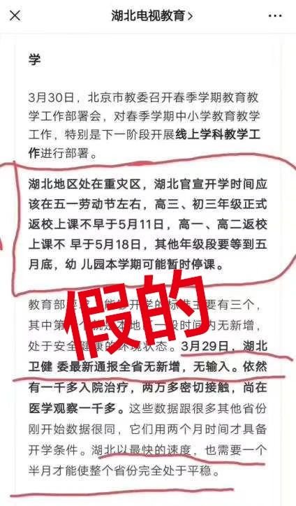 发布这则信息的微信公众号为“湖北电视教育”。发布者在微信中写道“湖北地区处在重灾区,湖北官宣开学时间应该在五一劳动节左右,高三、初三年级正式返校上课不早于5月11日,高一、高二返校上课不早于5月18日,其他年级要等到五月底,幼儿园本学期可能暂时停课。”