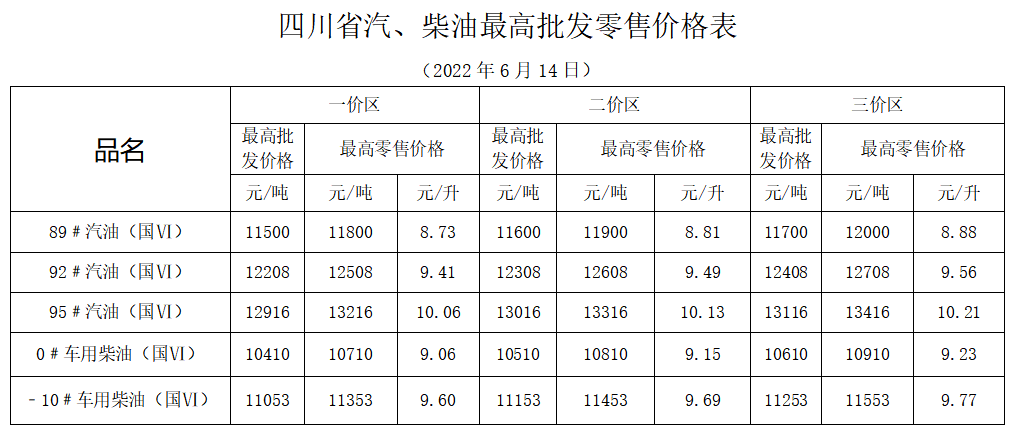 四川省汽、柴油最高批发零售价格表(2022年6月14日)