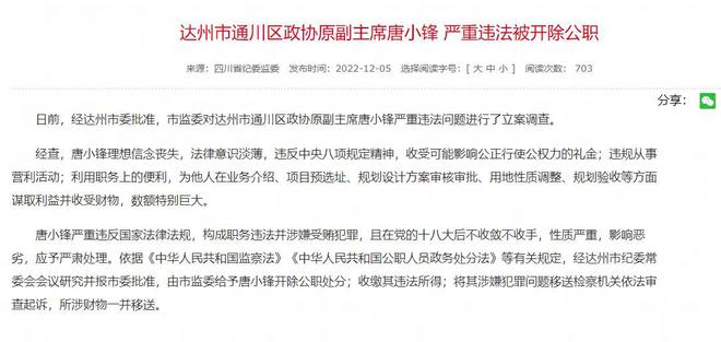 日前,四川省纪委监委刊文披露,在一次项目用地拍卖的关键环节,唐小锋借上厕所的时候用一部老年手机向商人透露底价,最后获得了高达700万元的感谢费。